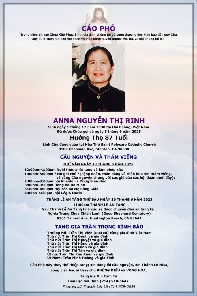 Nguyện xin Thiên Chúa sớm đưa linh hồn Anna về hưởng Nhan Thánh Chúa.
