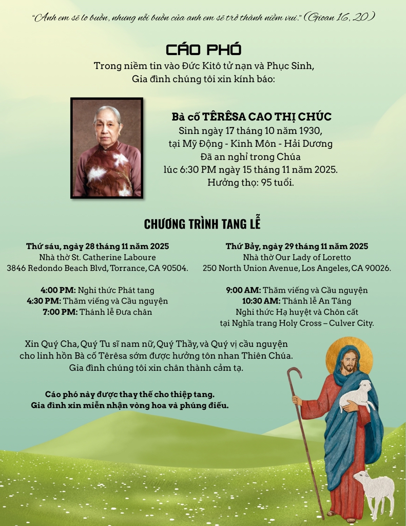 Nguyện xin Thiên Chúa sớm đưa linh hồn Bà Cố Têrêsa về hưởng Nhan Thánh Chúa.