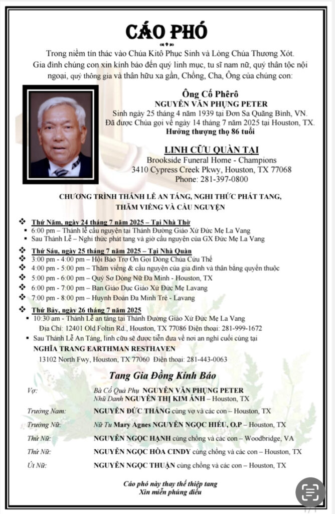 Nguyện xin Thiên Chúa sớm đưa linh hồn Ông Cố Phêrô về hưởng Nhan Thánh Chúa.
